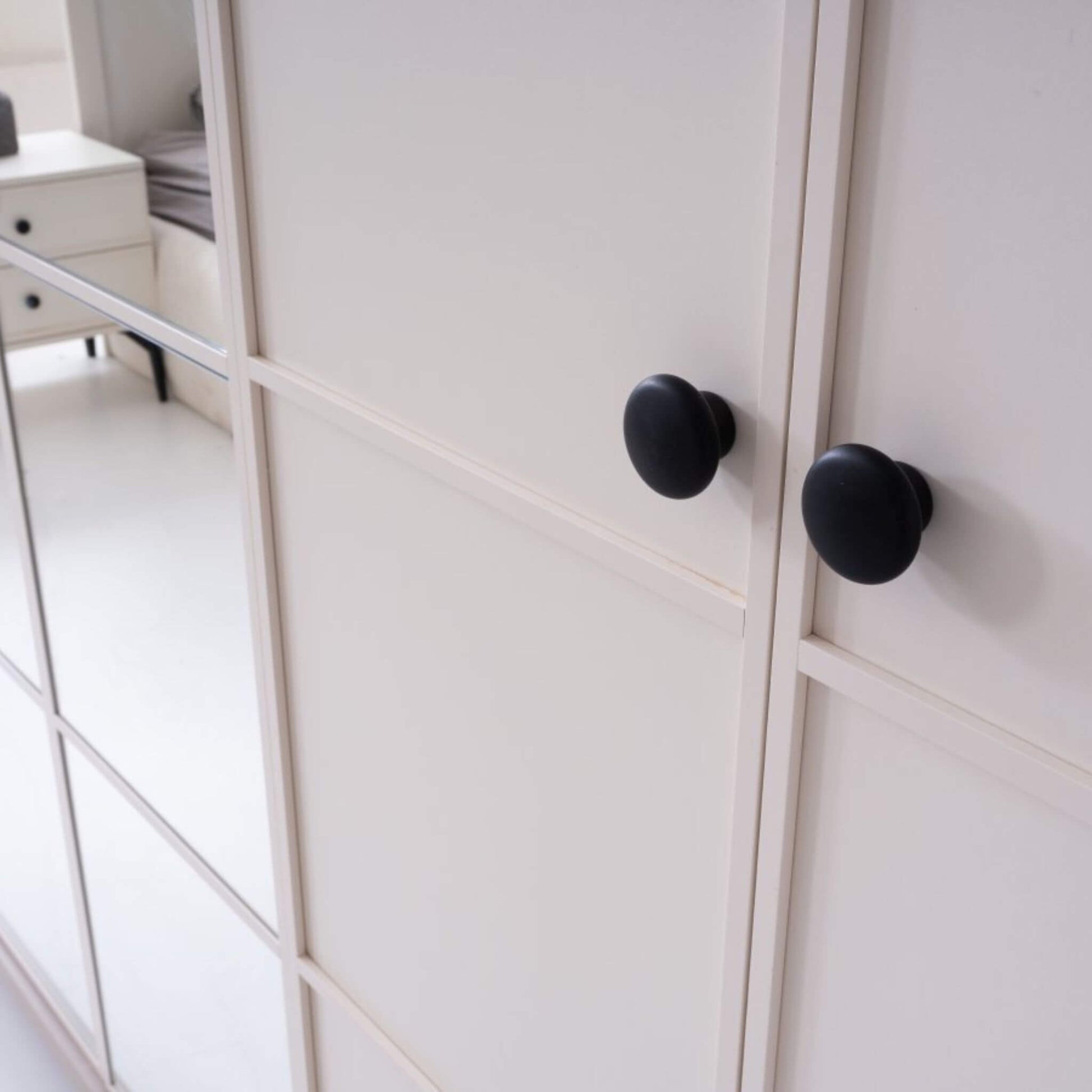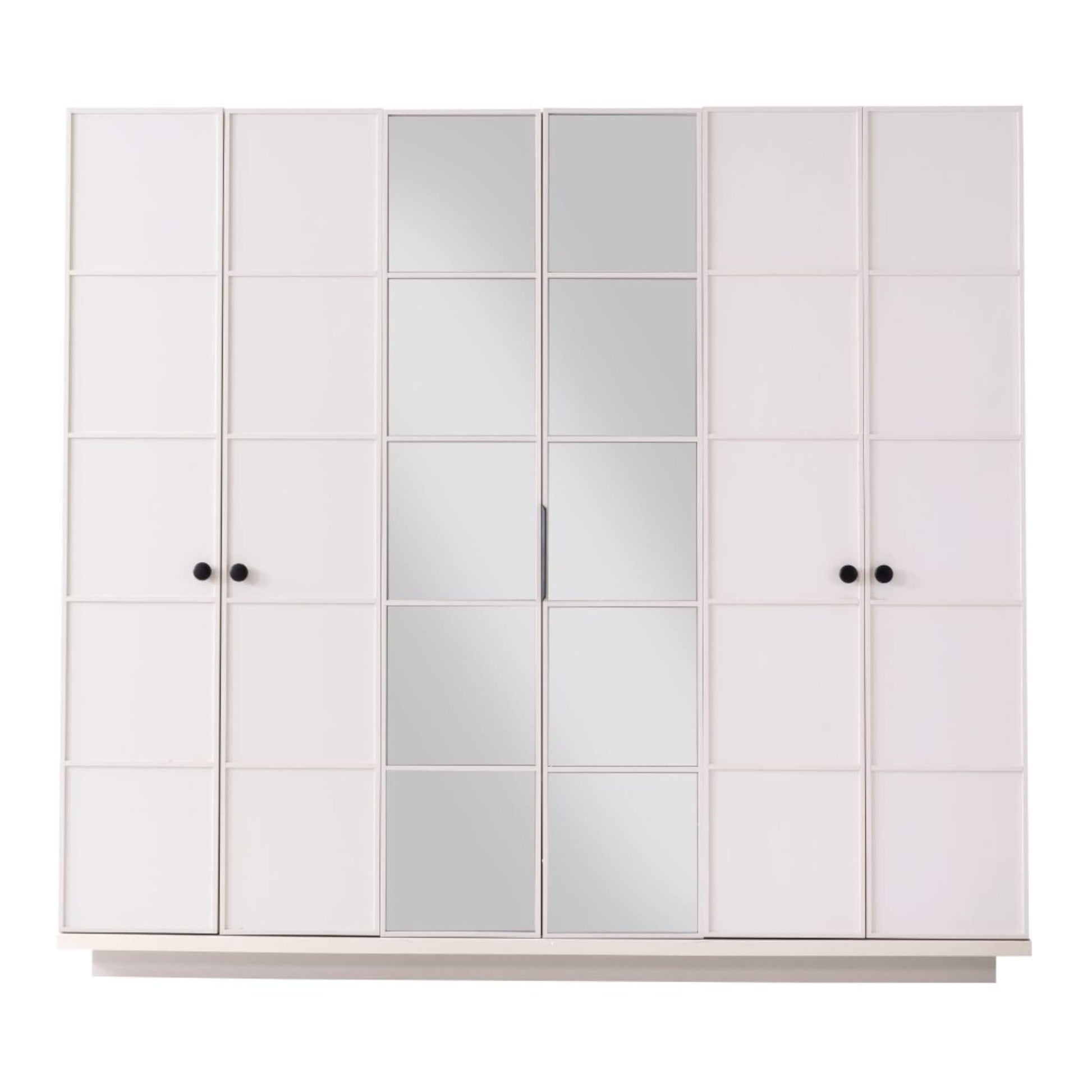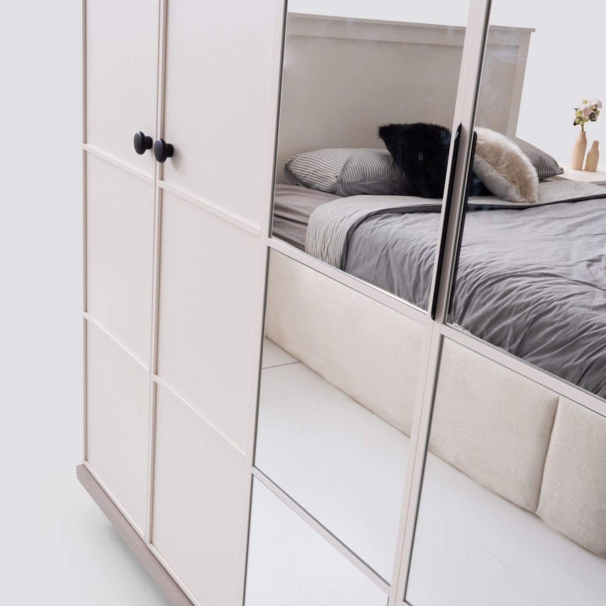 Geniş iç hacimli gardırop, aynalı orta kapakları sayesinde odanıza derinlik kazandırırken; komodin ve şifonyer modüllerindeki siyah kulp detayları takıma zarif bir kontrast ekler.
