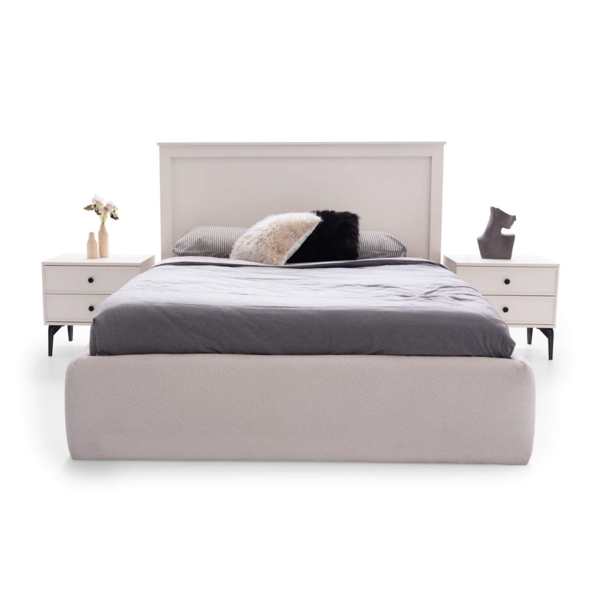 Tamamen beyaz yüzeyi, geometrik kapak tasarımı ve siyah modern ayak detayları ile Piano, yatak odasında ferah, düzenli ve sofistike bir atmosfer oluşturur.